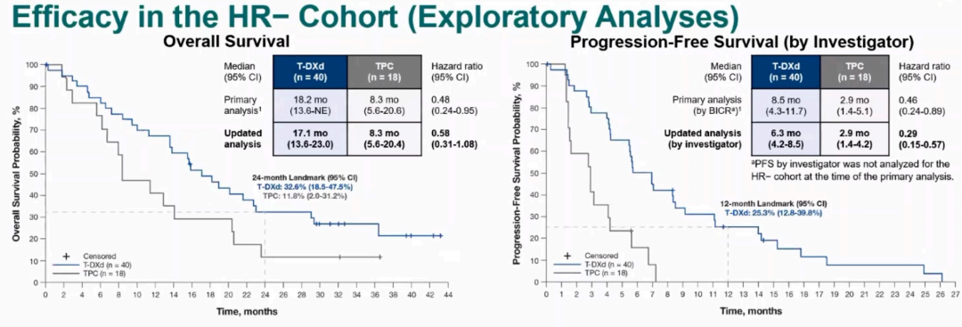遗憾的是,在2023年ESMO大会公布的最新结果[8]中,并未看到扩大HR-患者样本的数据。更新数据显示,总人群中T-DXd组和TPC组的中位OS分别为22.9个月和16.8个月(HR=0.69),HR-/HER2-Low亚组(即HER2-low的TNBC),T-DXd组和TPC组的中位OS分别为17.1和8.3个月(HR=0.58(0.31-1.08),HR跨1,无统计学意义),中位PFS分别为6.3和2.9个月(HR=0.29,但因为HR-阴性人群并未纳入预设统计学分析,无统计学意义)。